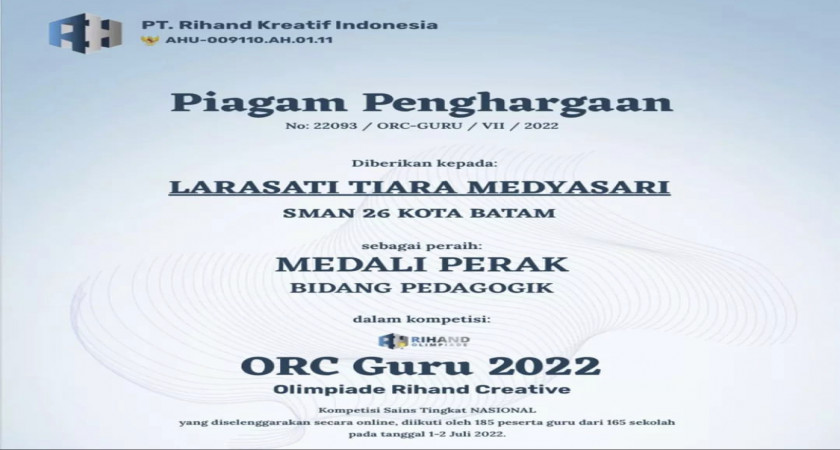Alhamdulillah SMA Negeri 26 Batam mulai telah mengkibarkan sayapnya. Di tahun 2022 ini, berbagai macam prestasi telah diperolehnya mulai dari peserta didik bahkan gurupun tak tertinggalkan untuk berpartisipasi mengikuti ajang perlombaan atupun olimpiade. Kini, calon doctor salah satu guru dari SMAN 26 Batam atas nama Bu Larasati Tiara Medyasari, M.Pd telah meraih medali perak pada ajang Olimpeade Rihand Creative 2022 di bidang Pedagogik yang diselenggarakan tanggal 1-2 Juli 2022 secara daring. Ajang kompetisi ini diikuti sebanyak 185 peserta guru dari 165 sekolah yang ada di Indonesia. Atas hasil prestasi ini, Kepala SMAN 26 Batam Bpk. Midiyanto S.Pd.,M.M mengaku sangat bangga dan bersyukur atas prestasi yang diraihnya. Ini merupakan langkah awal yang luar biasa bagi SMAN 26 Batam untuk lebih memacu prestasi di kompetisi-kompetisi yang lain. Selamat dan sukses untuk Bu Larasati Tiara Medyasari M.Pd.